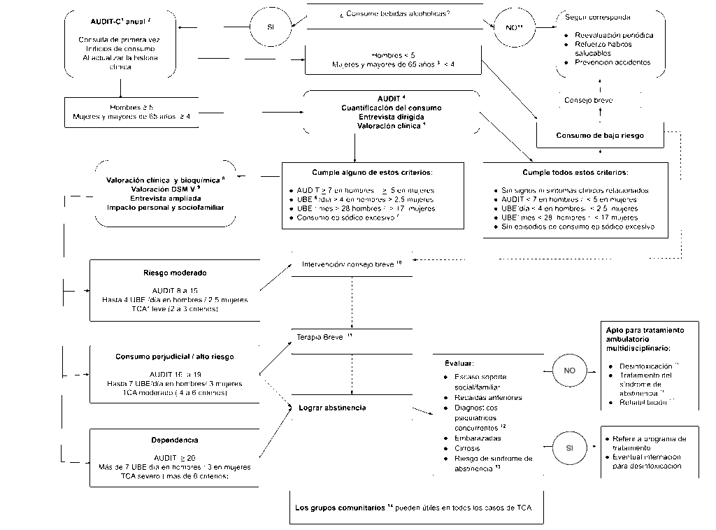 Referencias: *TCA: trastorno por consumo de alcohol ver en el texto (reemplaza la nomenclatura de alcohólico, abusadores o dependientes) **: aunque las personas no beban está recomendado hacer un rastreo periódico sobre todo en las personas jóvenes o aquellas que hayan bebido en algún momento de su vida. 1. AUDIT-C: Cuestionario de identificación de los trastornos por consumo de alcohol (AUDIT por su sigla en inglés) que valora el consumo, consta de tres preguntas. Ver en el texto. 2. Recomendación tipo B para los adultos mayores de 18 años, incluyendo embarazadas. 3. Las mujeres y las personas mayores de 65 años tienen menor tolerancia metabólica al alcohol por lo que se usan valores de corte menores a los de los hombres en general. 4. AUDIT completo: consta de 10 preguntas: las tres primeras se refieren al consumo de riesgo de alcohol, las preguntas cuatro a seis interrogan sobre síntomas de dependencia y las últimas tres preguntas valoran el consumo perjudicial. Ver en el texto.5. Valoración clínica: peso, presión arterial, glucemia, dislipemias, síntomas digestivos (ulcera, reflujo, dispepsia), foliculitis y trastornos de la piel, tendinitis (enfermedad de Dupuytren), síntomas de abstinencia matinal (temblor, nauseas), alteraciones de la sensibilidad periférica. 6. UBE (unidad de bebida estándar): 10 gr de alcohol que según la concentración de alcohol de cada bebida, representa un volumen determinado (ver en el texto). 7. Consumo episódico excesivo: episodios en donde una persona bebe en una única ocasión más de 6 UBE en los hombres y 4 UBE en las mujeres. 8. Marcadores biológicos: GGT (gamaglutamil transpeptidasa), FAL, GOT y GPT (enzimas hepáticas) y VCM (volumen corpuscular medio) sirven para valoración y seguimiento posterior. No deben considerarse diagnósticas en forma aislada. 9. DSM V: Manual Diagnóstico y Estadístico de las Enfermedades Mentales. El apartado para diagnóstico de trastornos por consumo de alcohol consta de 11 ítems. Ver en el texto. 10. Intervenciones breves: en consultorio, consejos sobre límites saludables, prevención de accidentes, evitación situaciones de alto consumo, plan para la moderación del consumo 11. Terapias breves: entrevistas repetidas, valoración de momento del ciclo en el que se encuentra el paciente, entrevista motivacional, visitas de seguimiento, plan de moderación del consumo. 12. Depresión severa, riesgo suicida, psicosis, etcétera. 13. Consumidores de altos volúmenes, antecedentes de síndrome de abstinencia, uso concurrente de benzodiacepinas, síntomas de abstinencia matinal. 14. Grupos comunitarios: por ejemplo, Alcohólicos Anónimos y para las familias Al-Anon 15. Desintoxicación: período en el cual el paciente deja de beber alcohol en forma absoluta, debe alertarse al paciente sobre los síntomas de abstinencia: sudoración, irritabilidad, temblor, agitación, ansiedad, convulsiones o alucinaciones (estas últimas deben motivar la internación del paciente. 16. El tratamiento habitual ante la aparición de síntomas son las benzodiacepinas, por ejemplo, diazepam 10mg cada seis horas durante dos días. 17. Rehabilitación: período de tiempo en donde el paciente sostiene la abstinencia a largo plazo. Se implementan las mismas estrategias de las terapias breves.