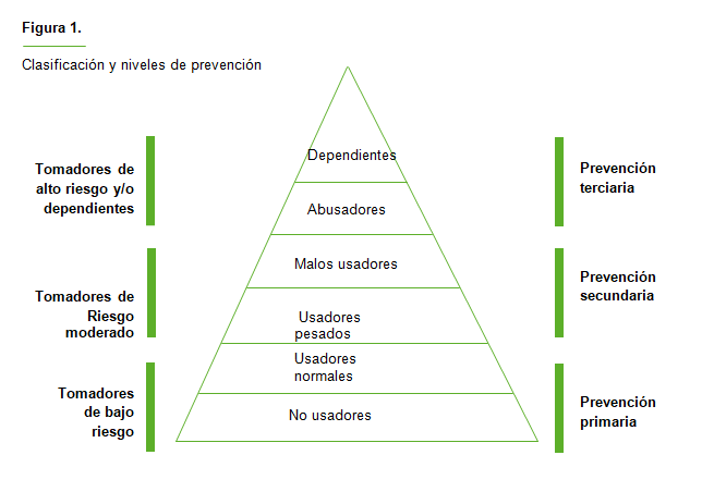 El uso de alcohol está ampliamente extendido en la sociedad. Su consumo no siempre implica patología, y muchos individuos se pueden clasificar como usadores normales de alcohol. Así, los tomadores de bajo riesgo representan el grupo más numeroso (ver la figura 1). En los dos primeros escalones de la pirámide se encuentran los no usadores (en este grupo se incluye a los abstemios y a los que toman muy esporádicamente bajas cantidades) y los usadores normales (ver más adelante).