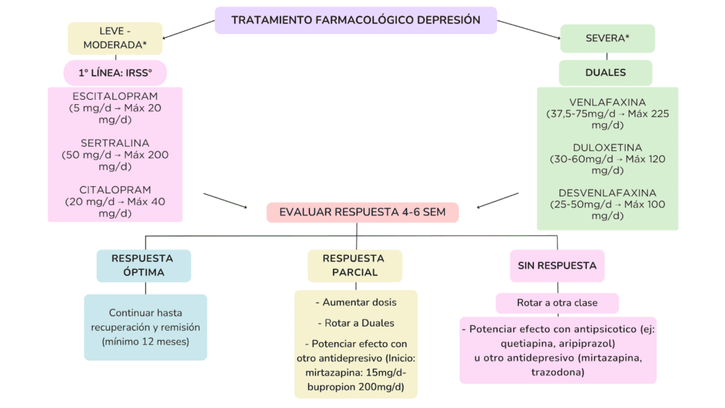 - En el tratamiento inicial de la depresión mayor severa se sugiere interconsulta para seguimiento por Psiquiatría e iniciar inhibidores de la recaptación de serotonina-norepinefrina (duales). De todas maneras no se descarta como posibilidad la opción de iniciar con IRSS como alternativa posible dependiendo del paciente y el perfil de efectos adversos de cada grupo farmacológico.