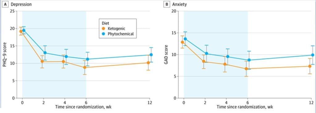 La gravedad de la depresión disminuyó notablemente en ambos grupos; el cambio medio (DE) en la puntuación del PHQ-9 desde el inicio hasta la semana 6 fue de -10,5 (7,0) en el grupo de dieta cetogénica y de -8,3 (5,1) en el grupo de fitodieta.